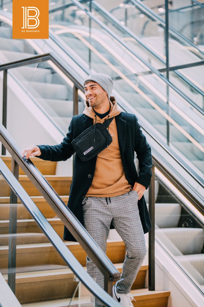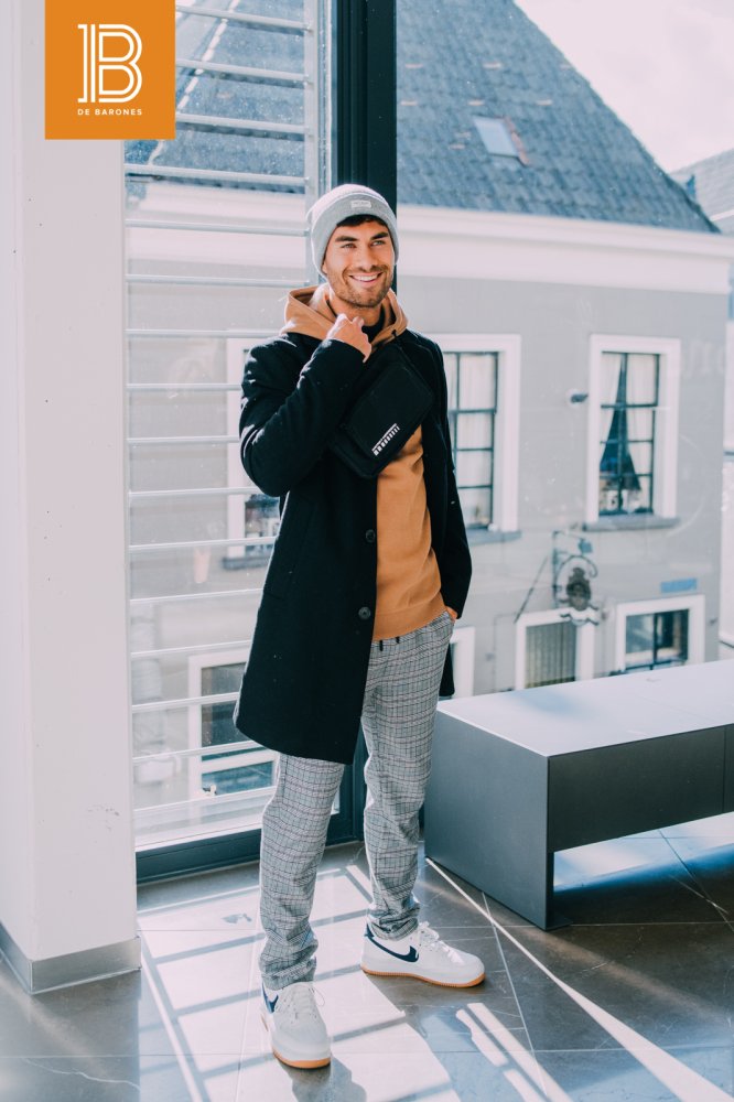 In deze outfit van The Sting worden verschillende trends die we al eerder zagen gecombineerd. Zo zien we de ruitjes weer terugkomen in de sportieve pantalon. Daarop gedragen zien we een karamel bruine hoodie met daarover een zwarte halflange jas. De halflange jas is naast de parka en de puffer coat een jas die we veel zien. De zwarte kleur zorgt ervoor dat deze jas met vrijwel iedere outfit te combineren is!