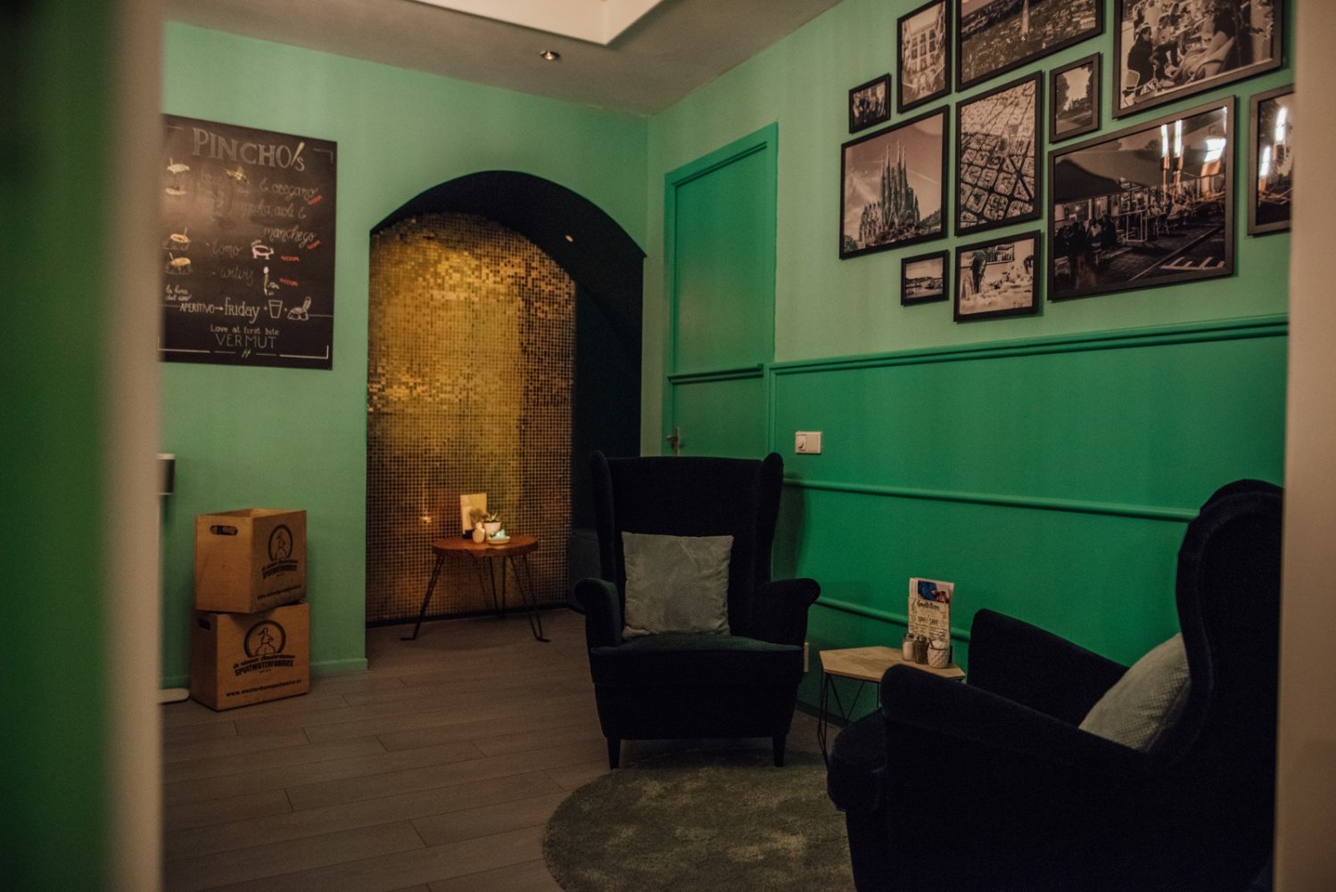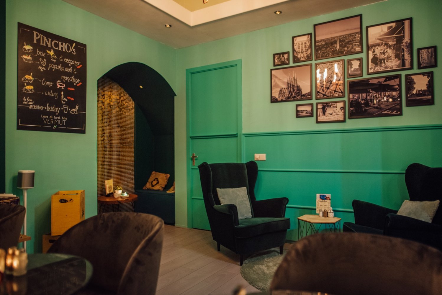 Aan de muur zien we een collage met foto's uit Barcelona, Breda en van Vermut. Charety is zelf half Spaanse en heeft ook een tijdje in Barcelona gewoond, hier heeft ze de inspiratie voor haar zaak vandaan.