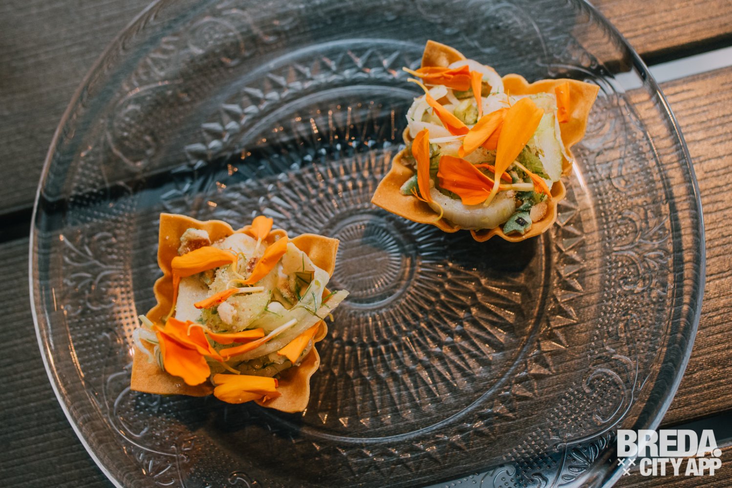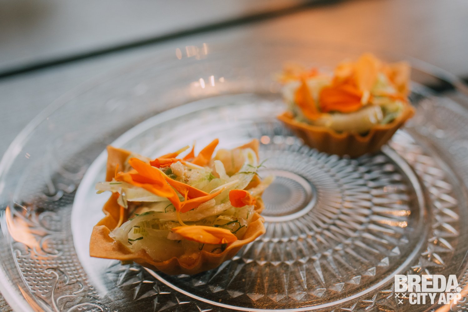 Vol enthousiasme verteld Bing met welk gerecht we starten, het is duidelijk dat hij een passie heeft voor gastronomie en gastvrijheid. We beginnen met een verfijnd voorgerecht, bestaande uit een tartaar van garnalen aangemaakt met groene appel, limoen en furi kake ingerold in verschillende soorten radijs met zilte groentes, een sap van gefermenteerde asperge en krokant van waterkers.