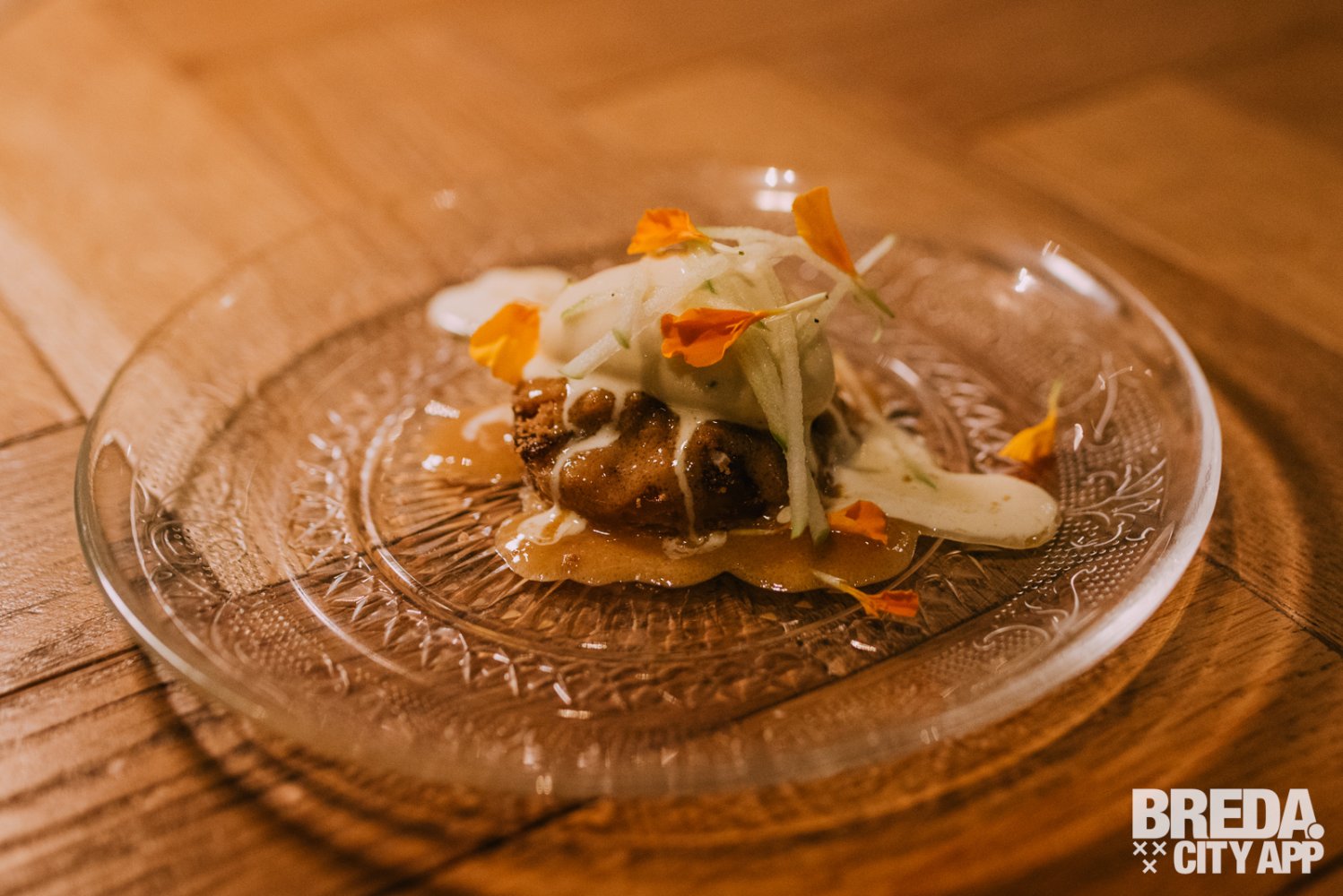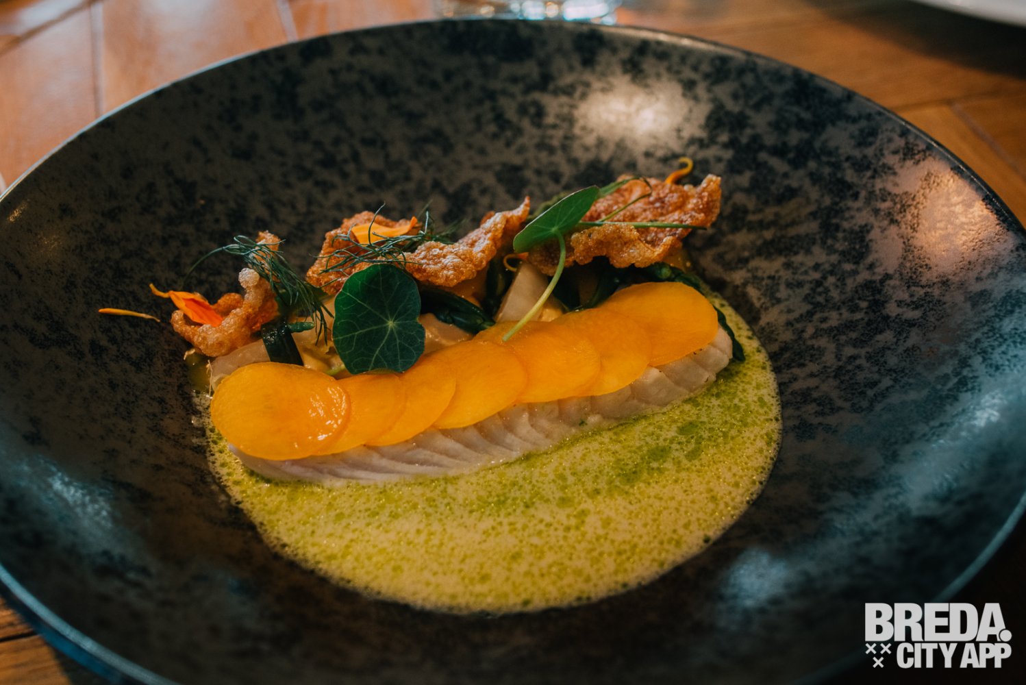 Daarnaast een ceviche van zeebaars, een gerecht dat heel goed wordt ontvangen door de gasten bij de veestallen. Hierbij een frisse gel van kalamansi, pompoen rondjes en een pompoen creme met ponzu en hangop en natuurlijk de huisgemaakte kimchi kroepoek. Om het helemaal af te maken serveren ze er een vinaigrette bij van schapen kefir en zilte groentes.
