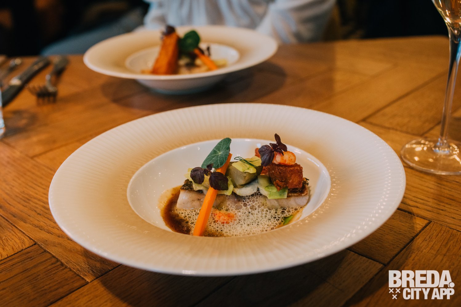 Als tussengerecht krijgen we een stukje gebakken corvina, geserveerd met een bouillon van paling en unagi, daarbij een schuimige beurre blanc en rösti met artisjok.