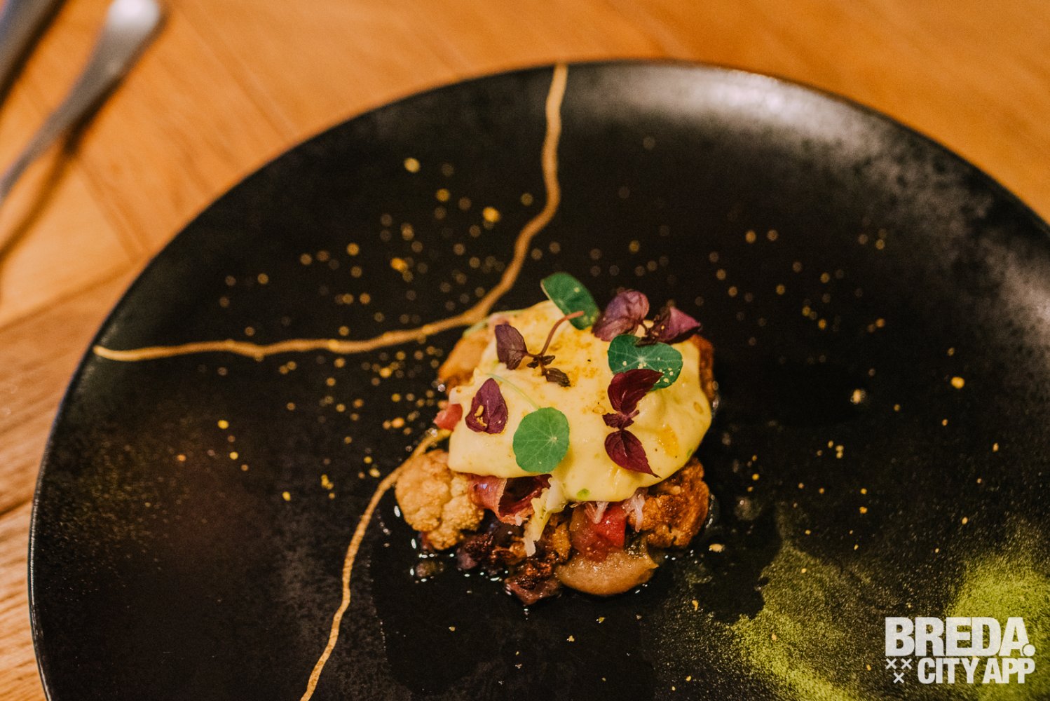 Mijn tafelgenoot krijgt een ander menu omdat zij hier nog niet zo lang geleden al heeft gedineerd met het surprise menu. Zij krijgt als tweede tussengerecht geroosterde bloemkool met kimchi, pata negra en een luchtige hollandaise.