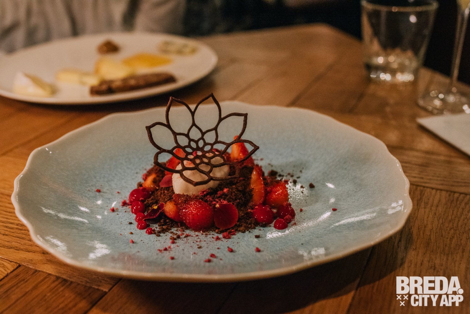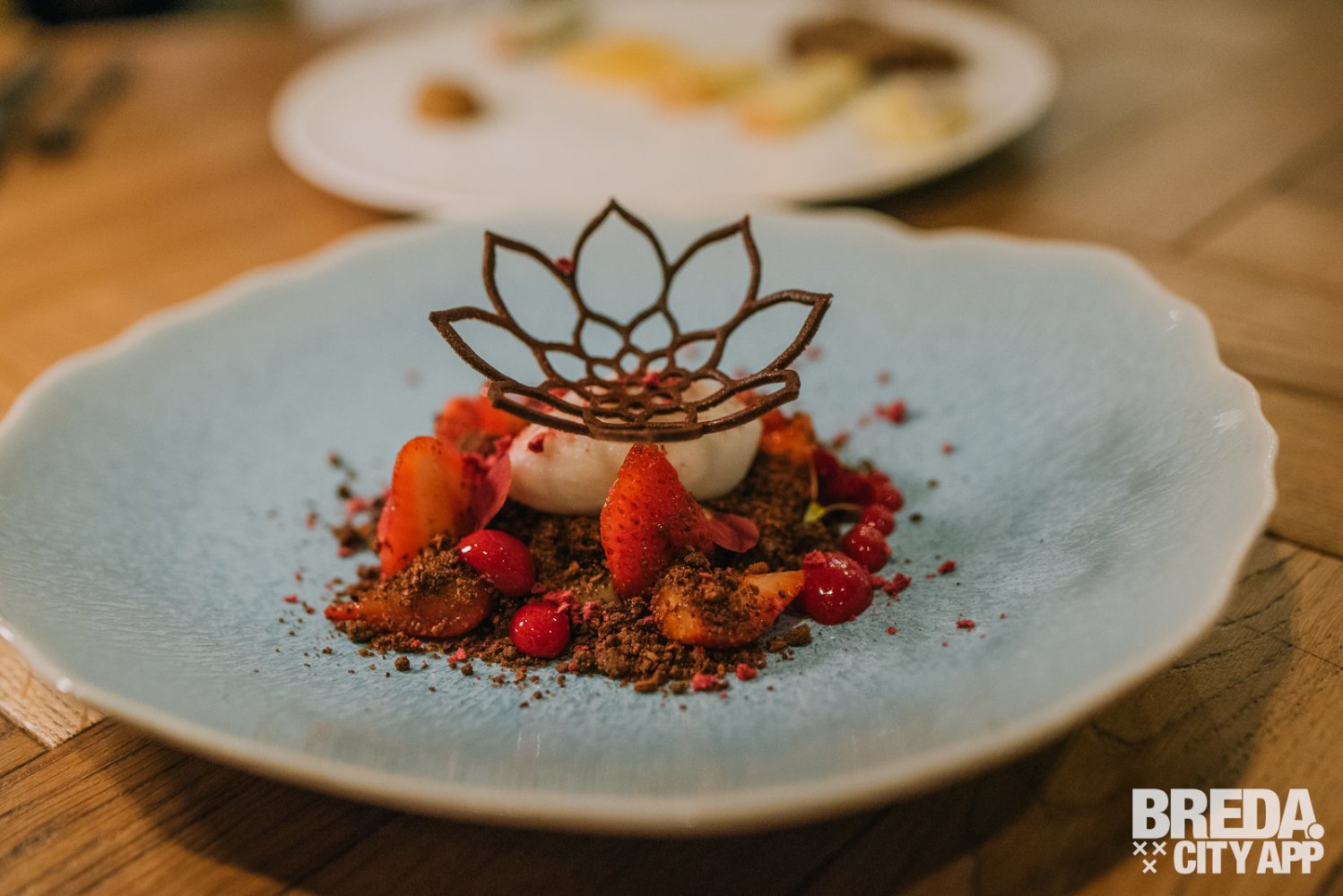 Als dessert een hele mooie afsluiter voor in de zomer, heerlijk rood fruit in verschillende bereidingen, met lemon curd, een compote van rabarber en een sorbet van lychee en bubblegum. Een crumble gemaakt met gebakken witte chocolade en moerbei en om het helemaal af te maken een bloem van chocolade.