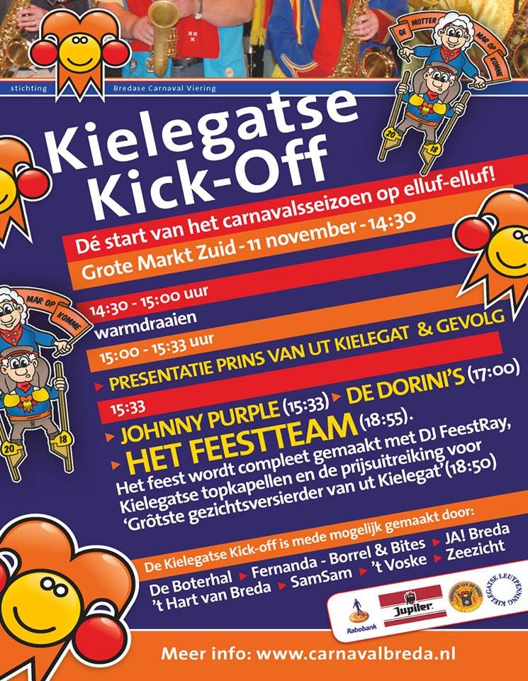 De start van het carnavalsseizoen beleef je natuurlijk op de Grote Markt. Warmdraaien vanaf 14.30 uur. Om 15.11 uur weten we wie de nieuwe Prins Carnaval van Kielegat is! Vanaf dan kan het echte feest natuurlijk losbarsten met Johnny Purple, De Dorini's, Het Feestteam en DJ FeestRay!