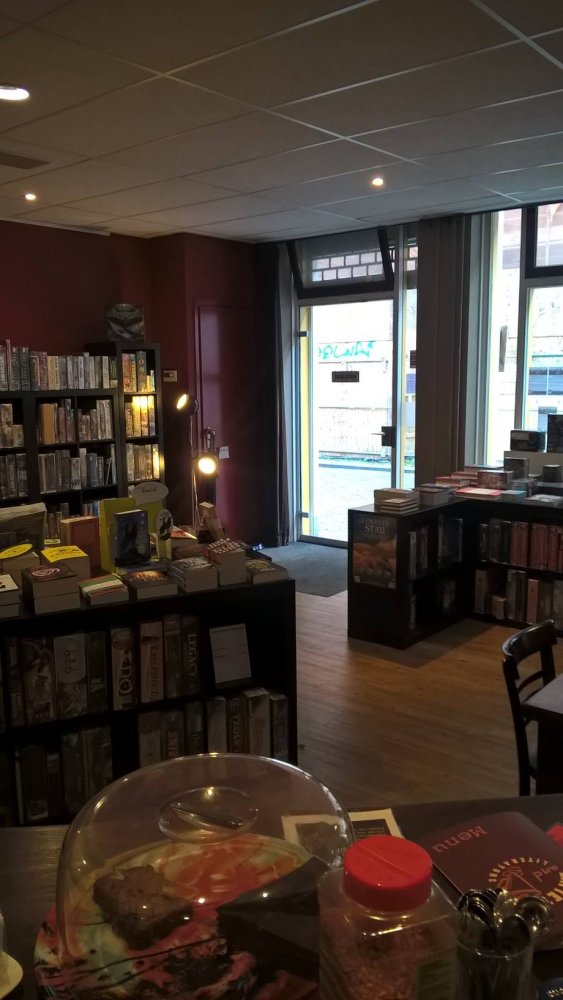 In de boekenwinkel kunnen klanten ook zitten en een bakje koffie of thee drinken met een stukje zelfgebakken taart.