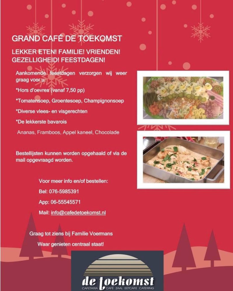 Welkom bij Cafe, Zaal, Eetcafe, Cafetaria de Toekomst te Achtmaal Gelegen in een dorp aan de rand van het land, bieden wij een diversiteit aan producten en diensten aan. Via onze overzichtelijke website proberen wij u een beeld te geven van al onze mogelijkheden. http://www.cafedetoekomst.nl/ Voor vragen en of reserveringen kunt u altijd contact met ons opnemen Groeten Jan en Lia Voermans