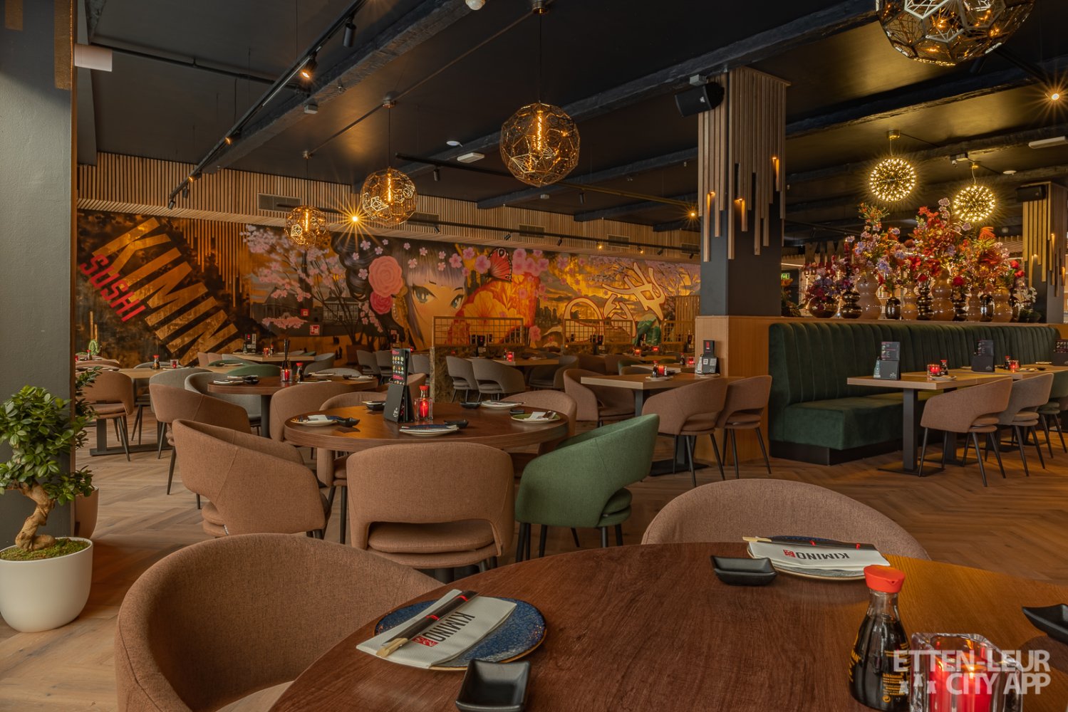 Japans Restaurant Kimino aan het Raadhuisplein 33. De mooie ruime zaak telt zo'n 150 zitplaatsen. Absolute eyecatchers zijn de graffitiwanden met moderne en traditionele Japanse illustraties.